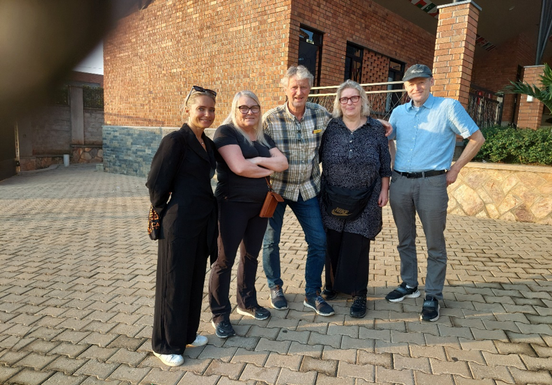 På bilden: Från vänster Anna Sundell rektor på Kabojja skolan i Kampala samt resenärerna Annica Pettersson, Göran Olausson, Lena Stålklo och Bengt Gunnarsson